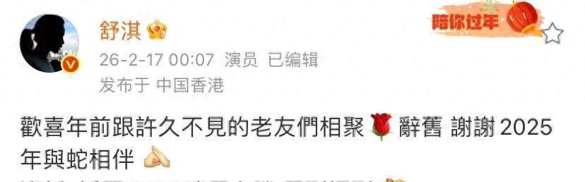 舒淇深夜在微博上发了一组照片,显示她已经返回香港过年了。那几张照片是她和朋友们在除夕之前的聚会照,她还特别感谢大家在蛇年的相遇,祝愿马年马到成功、福气满满。